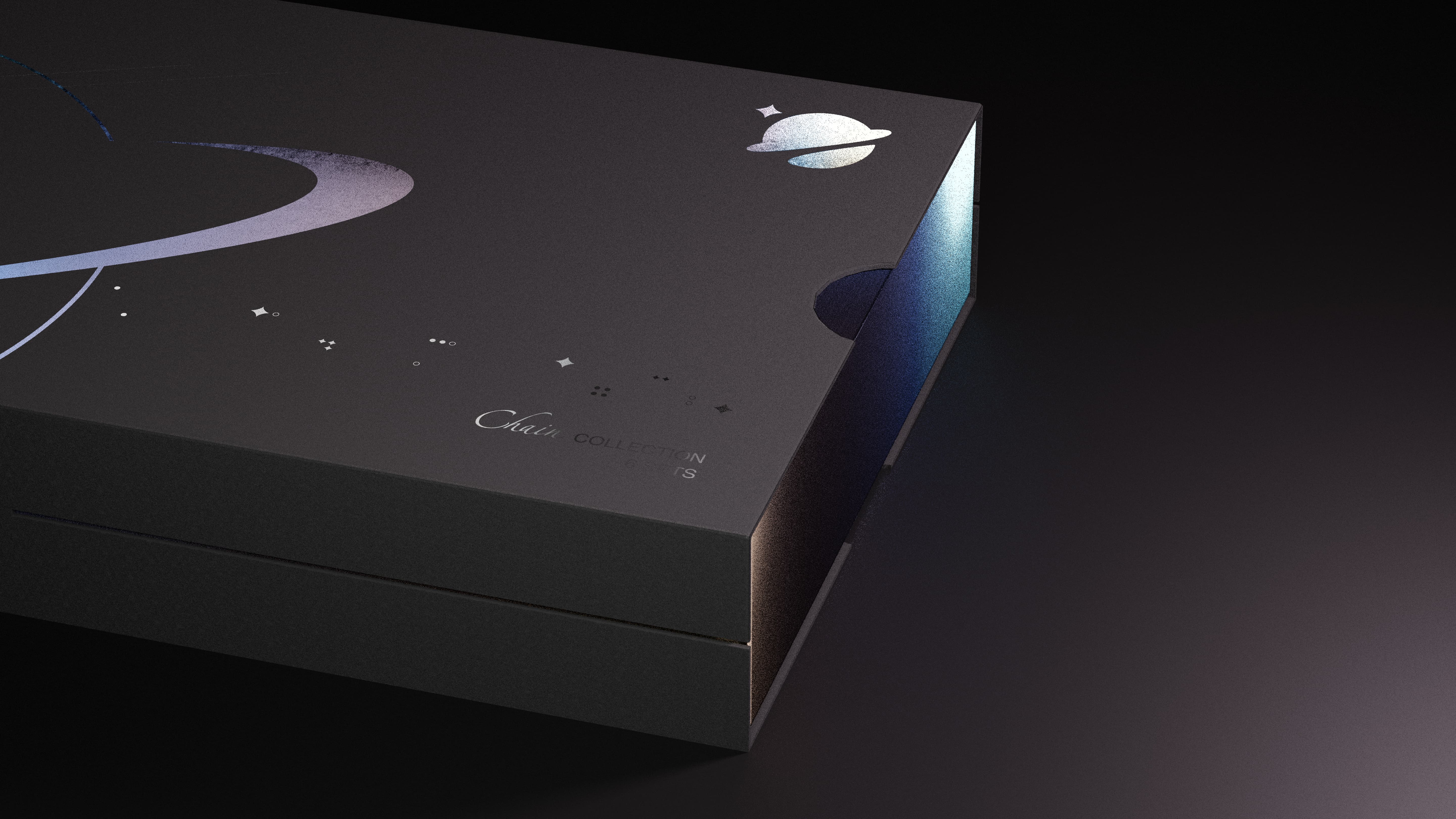 We started this project by looking up at the starry sky, a thought occurred to us: why don't we bring the whole starry universe inside each of these designs. The results we achieved exceeded our expectations, each jewelry box is compact, mysterious, luxurious with a dominant black color, embellished with a colorful light line that makes it all magical.