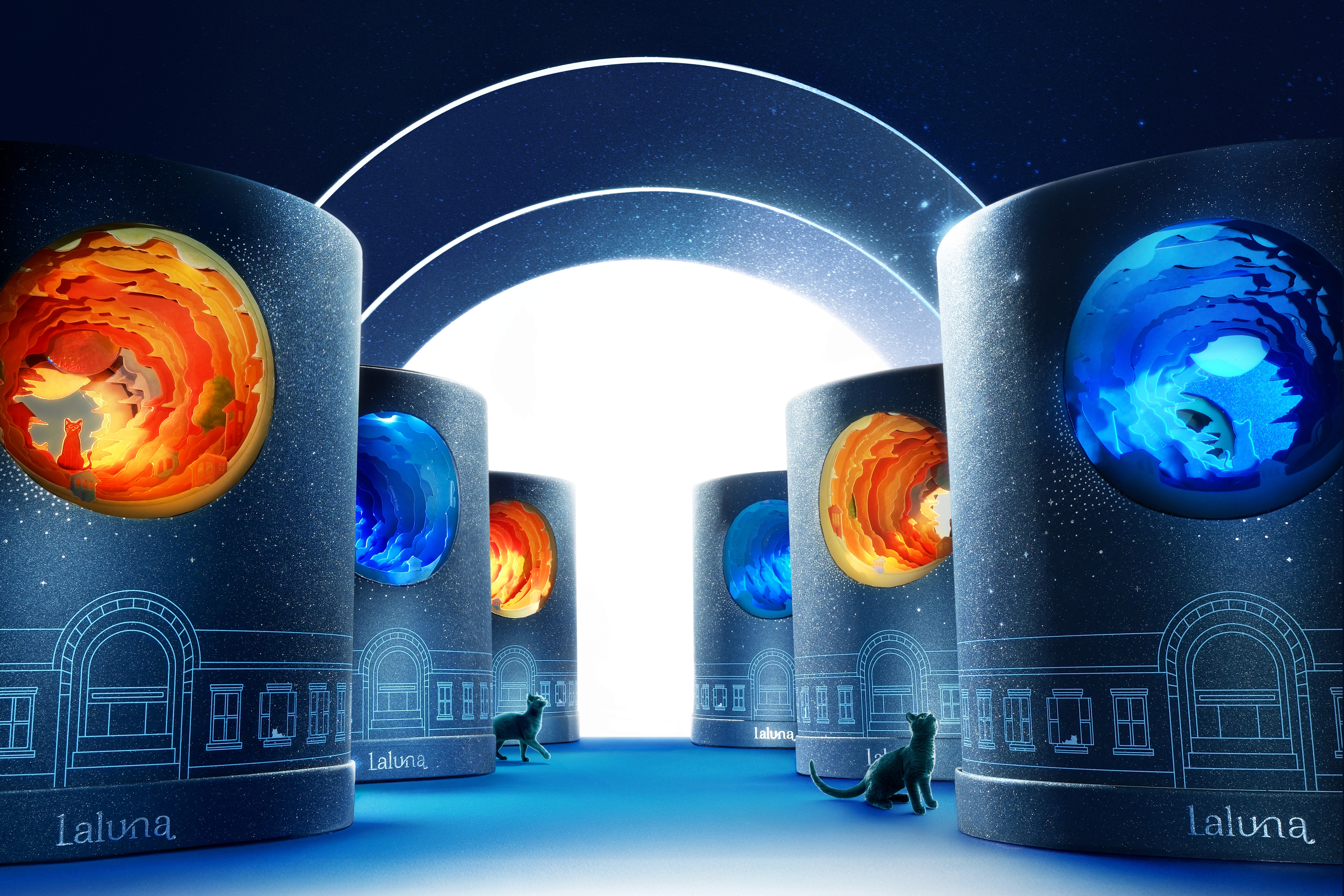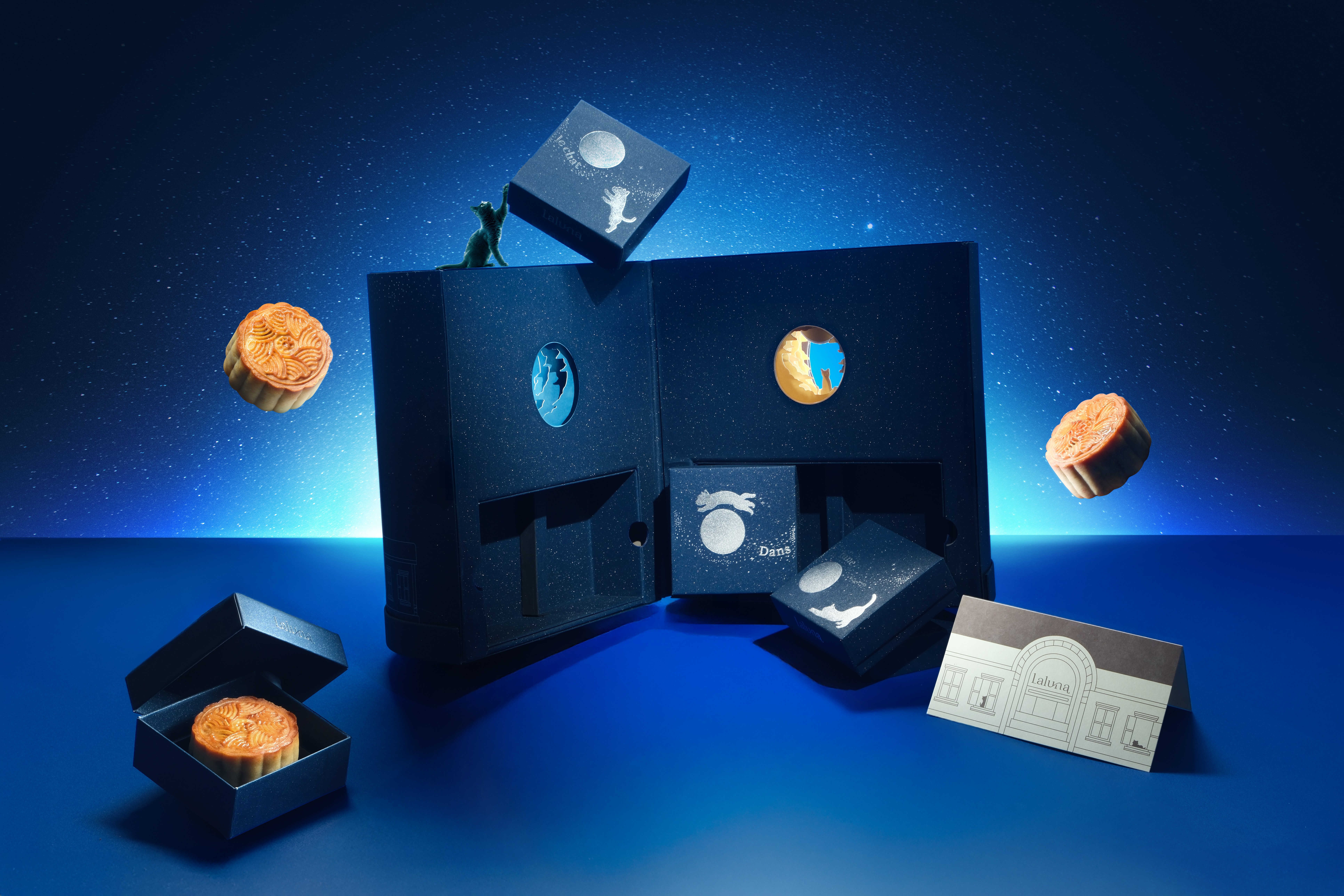 Amid the endless rotation of day and night, the Laluna Cafe & Brunch mooncake box unfolds like a slow-motion film: layer by layer, a landscape rises into a tunnel of time, where the black cat — Laluna’s mascot — sits calmly at the heart of the story, observing the ever-changing world while remaining true to its own grace and character.