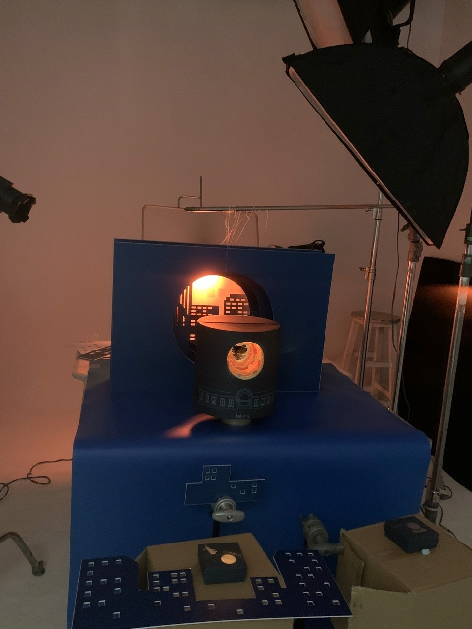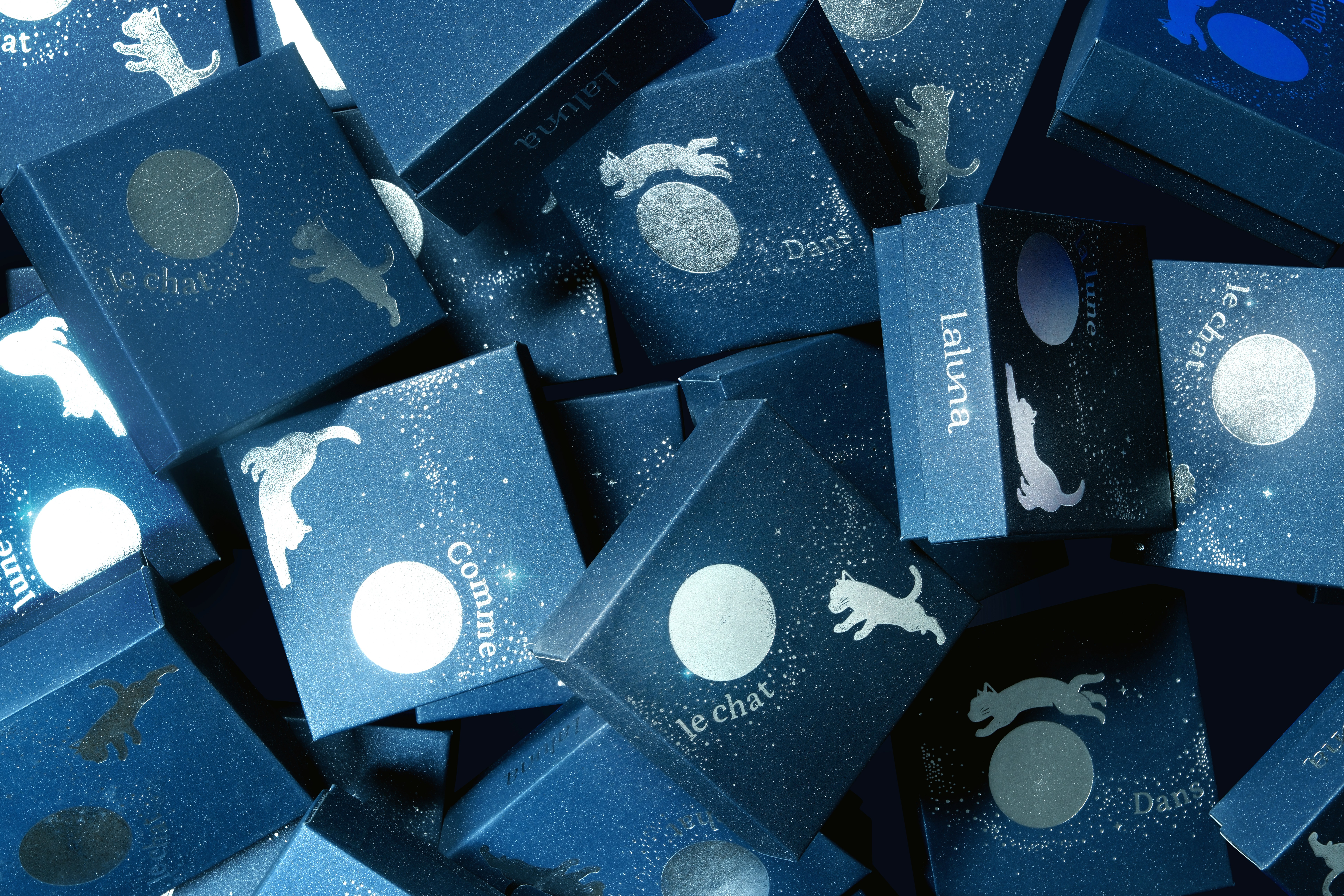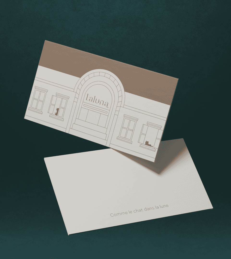 Encircling the body of the box is a minimalist illustration of Laluna’s iconic storefront — a subtle architectural line drawing of doors, arches, and windows. It serves both as a mark of identity and an invitation to enter “a Laluna night” — where the café stands beneath the moon, serene and luminous. The box opens from the center like a book, revealing a stage-like moment: two panels parting like velvet curtains to unveil four mooncakes nestled symmetrically on each side — a balance that elevates both ceremony and emotion. Every detail carries thoughtful precision: a minimalist leather handle that turns the box into a fashion-like accessory; seamless folds that enhance the tactile experience; and the inner circular cutouts — twin “time portals” inviting the gaze deeper into the scene. The visual narrative is built using the paper theater technique — soft, wave-like contours layered to create depth and shadow. The “day” side is painted in honeyed tones of orange, amber, and warm wood — sunlight pouring over houses and trees. The “night” side descends into layers of cobalt, navy, and silver mist — expanding into a quiet cosmos where the moon becomes the reason for every movement. At the center, the black cat is the heartbeat of the entire composition — its wide eyes and calm posture evoking the timeless presence of a silent observer, a keeper of memory. Amid countless trends and passing styles, the cat embodies Laluna’s statement of identity — a voice of quiet confidence that doesn’t chase noise, but cultivates intimacy and belonging.