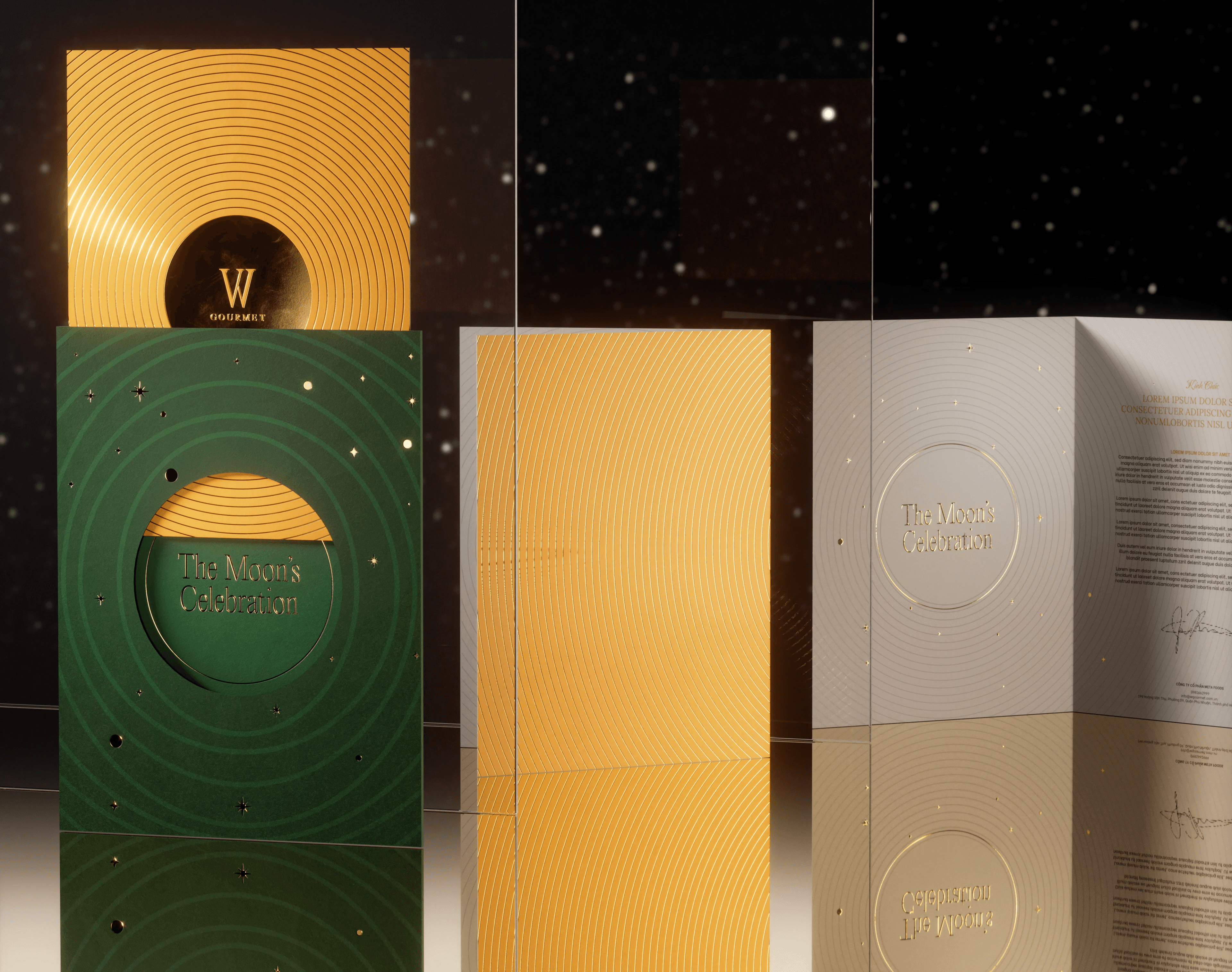 To honor the uniqueness of the subject, Bracom's design team employed paper scanning and light techniques. With flexible folds and artistic adaptations on the surface, the "Full Moon" emerges with a fresh, magnetic beauty, no longer a simple smooth sphere. The fusion of paper material and curvatures breathes modernity into an image seemingly traditional and familiar. Not only illuminated by light, but the moon also becomes even more impressive through meticulously artistic, romantic details. Techniques of gold foil stamping and embossing bring sharp yet natural renditions of stars, beams of light, and sky clouds.